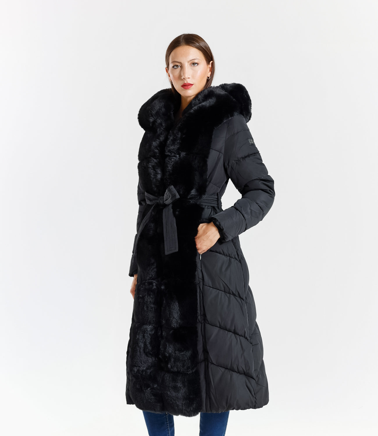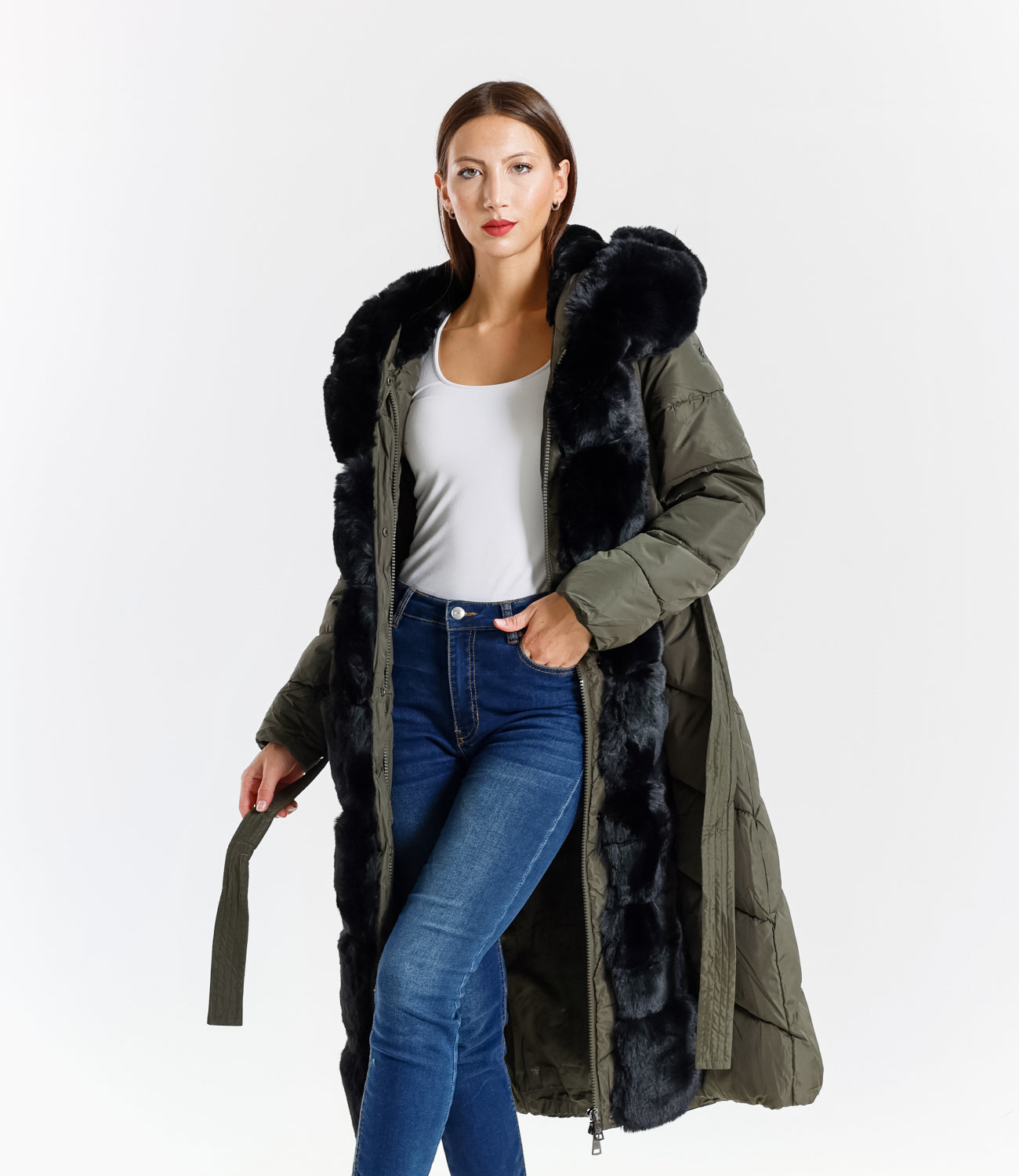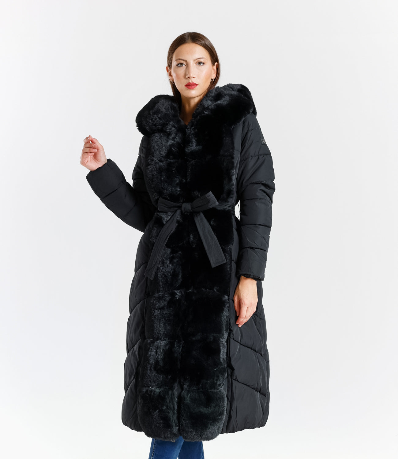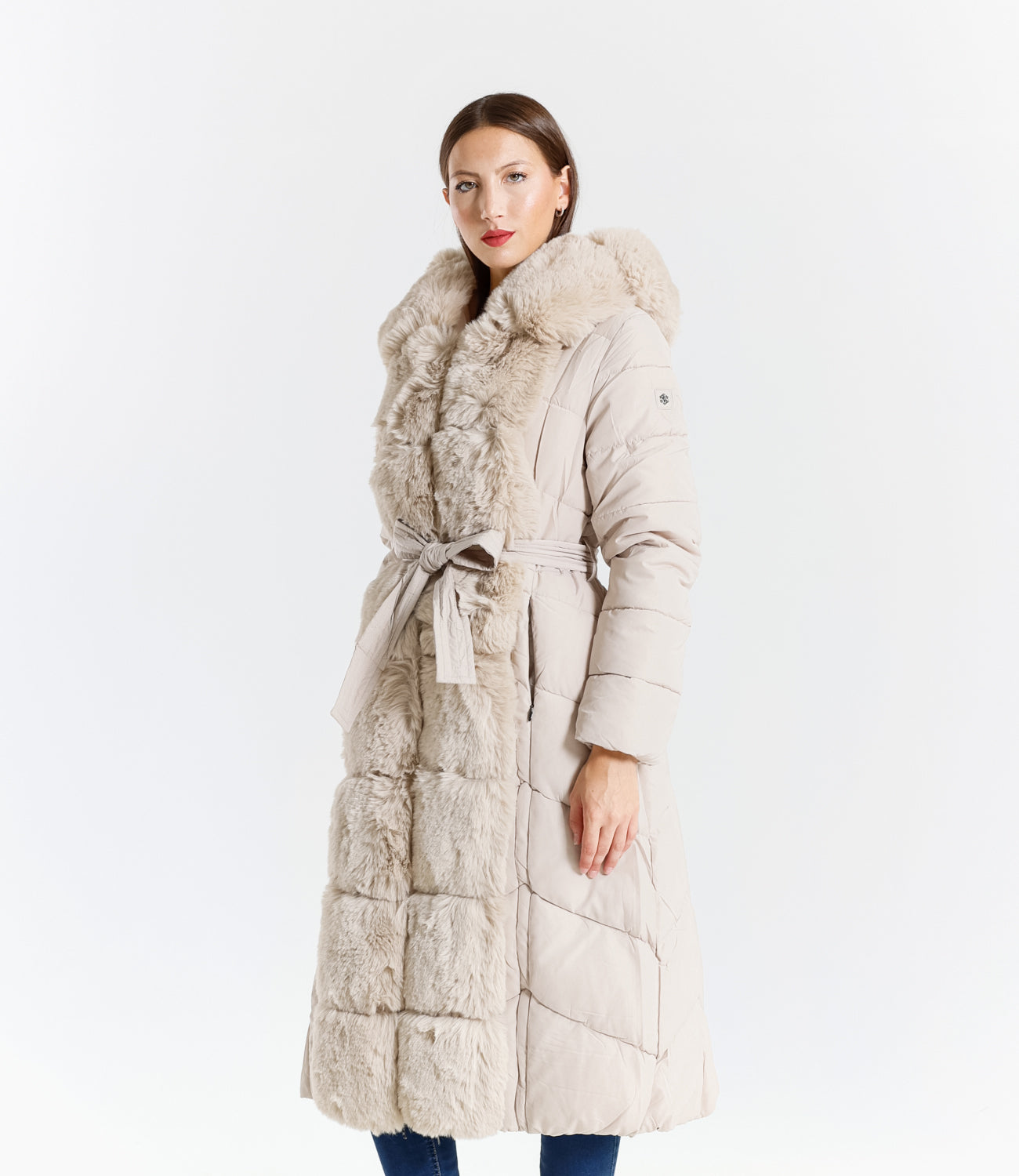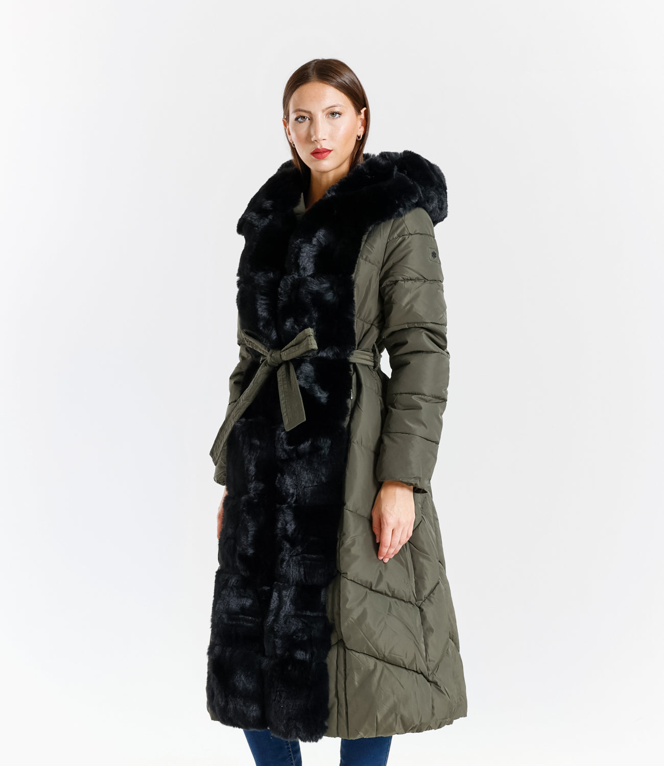 Piumino lungo donna con inserti in pelliccia sintetica e cintura