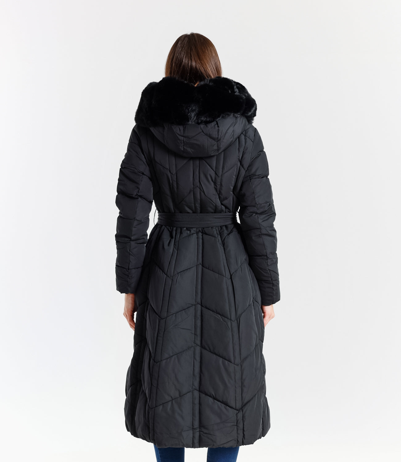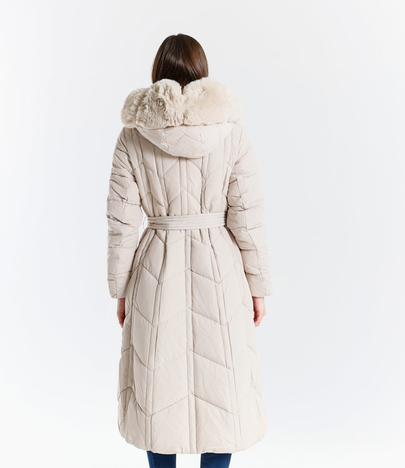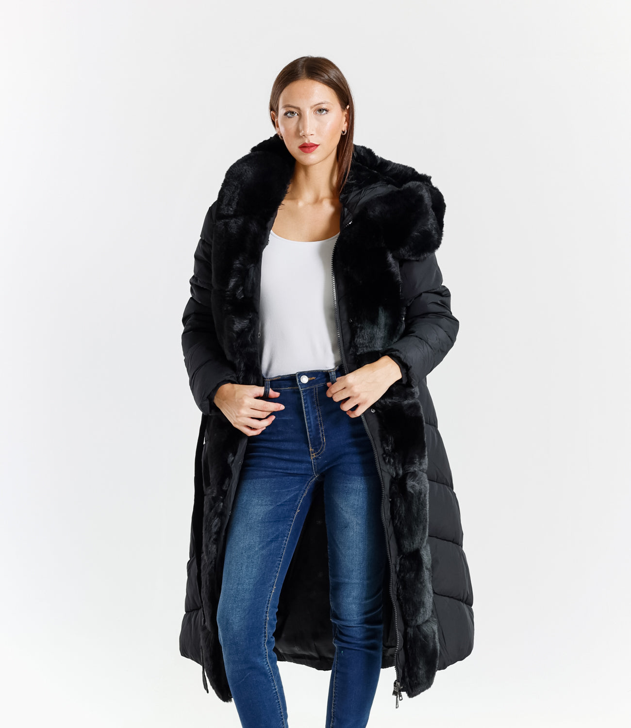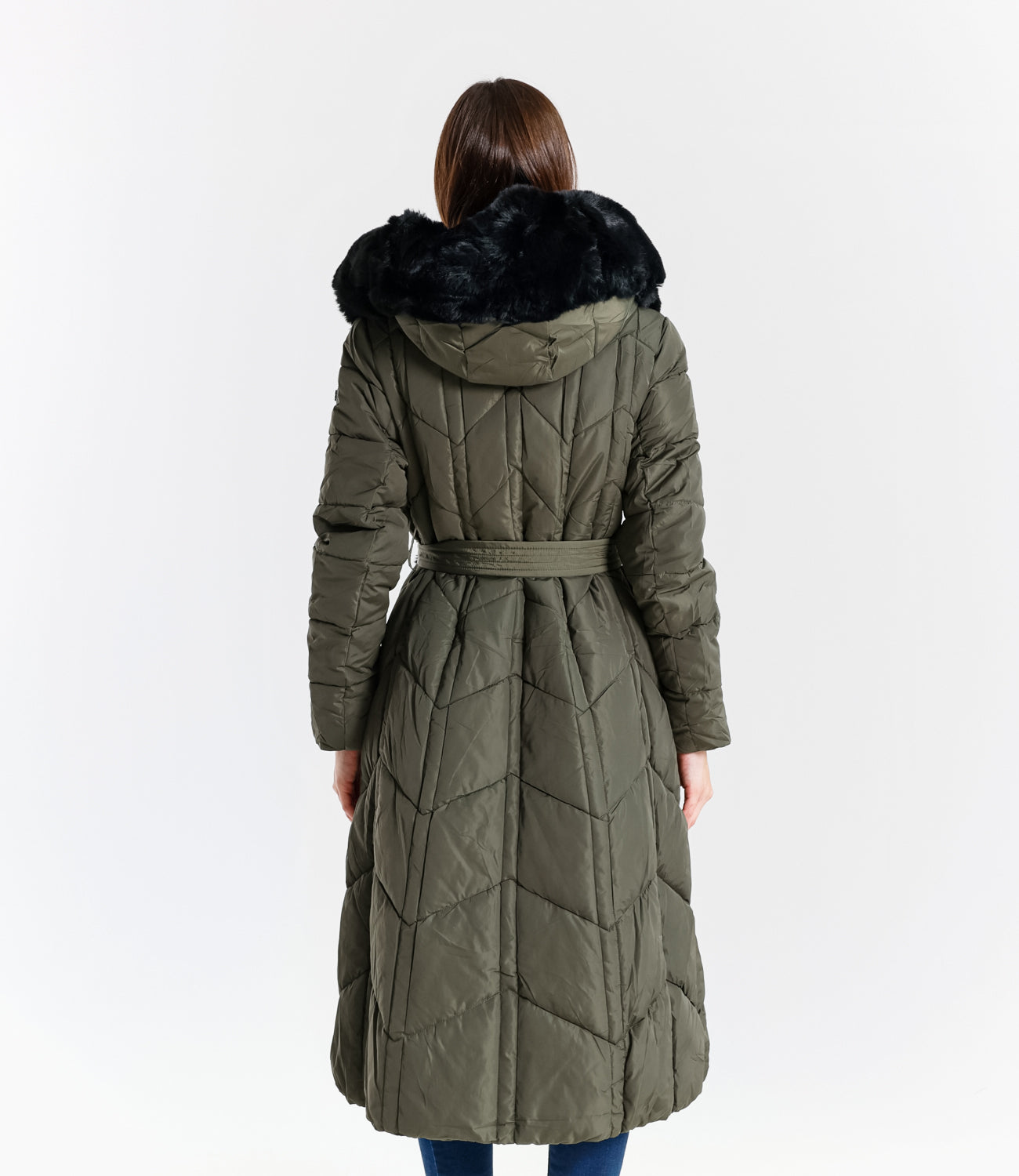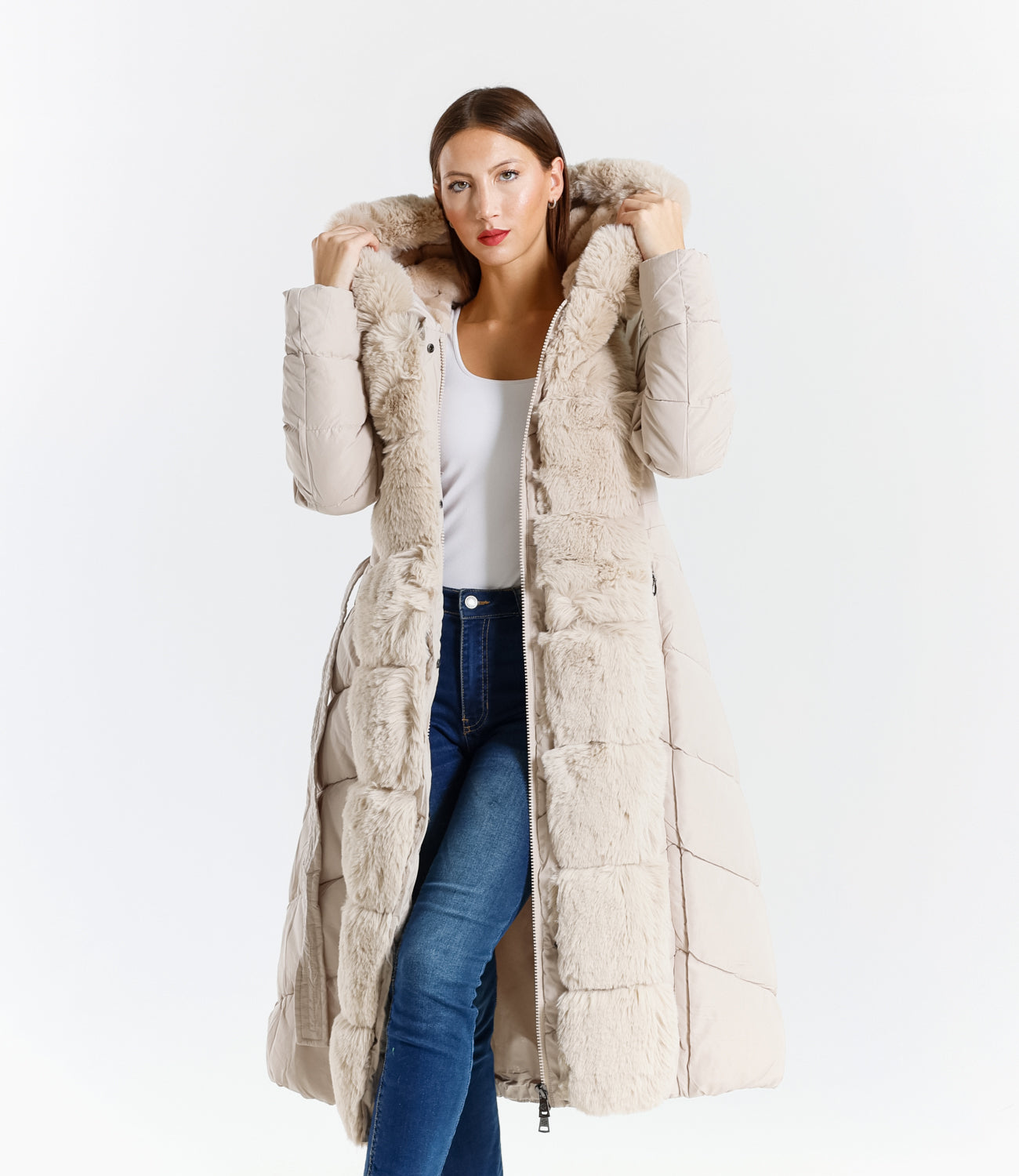 Piumino lungo donna con inserti in pelliccia sintetica e cintura