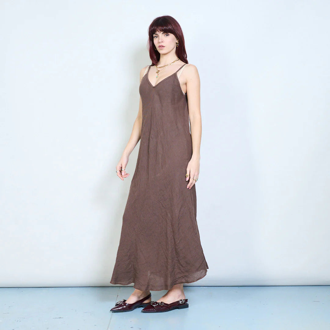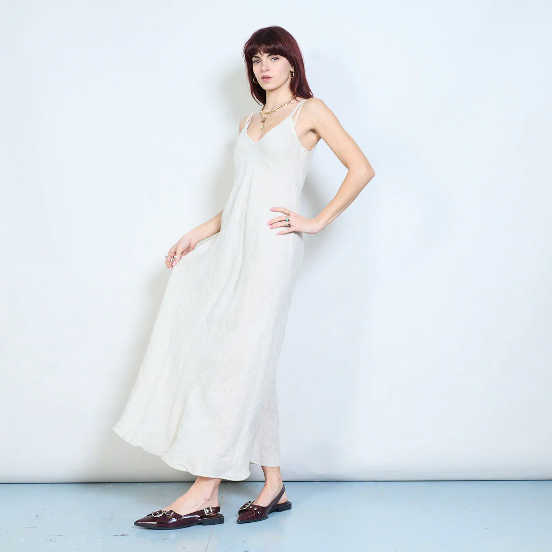 Abito lungo da donna con spalline sottili e delicato scollo a V, caratterizzato da una linea fluida e minimal. Il taglio morbido accompagna la silhouette con eleganza naturale, creando un effetto leggero e raffinato.